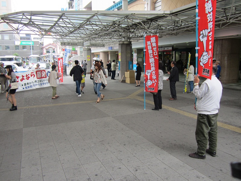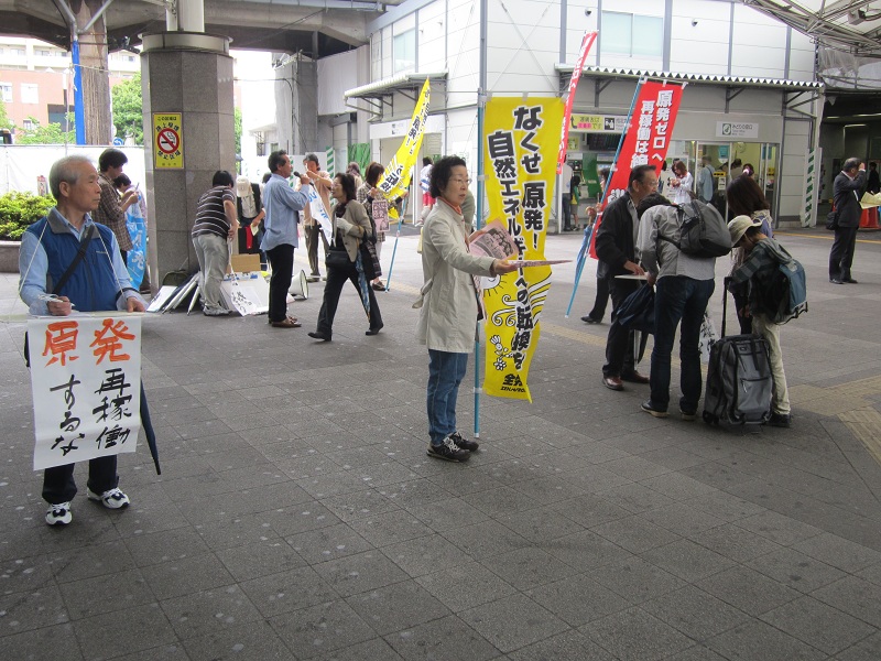 野田首相が今日にも原発再稼働を最終判断するということで(現時点では決断したと報道されていますが)、福島の事故が終息せず、原因究明もほとんど手がついていない中で、安全対策も不十分なまま、これほど国民生活に直接かかわる問題を十分な国会審議もせずに数人で勝手に決めてしまうことは許せないと、12団体32人が新越谷・南越谷駅利用者や通行する人たちに呼びかけました。各団体で工夫したビラや署名、のぼりや横断幕などを持ち寄り、日本共産党が用意した原発0を求める署名は116筆とたくさんのご協力をいただきました。