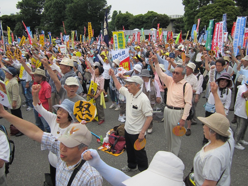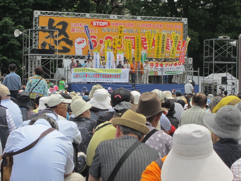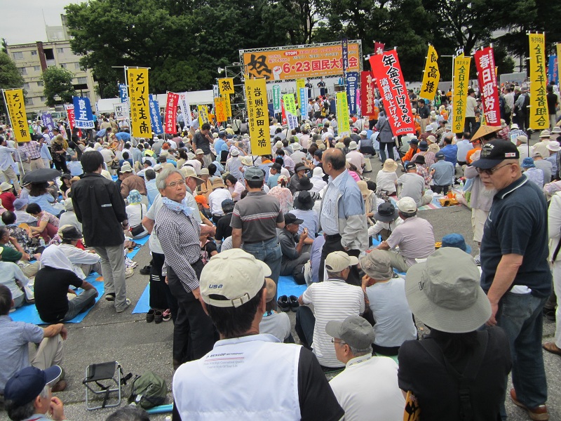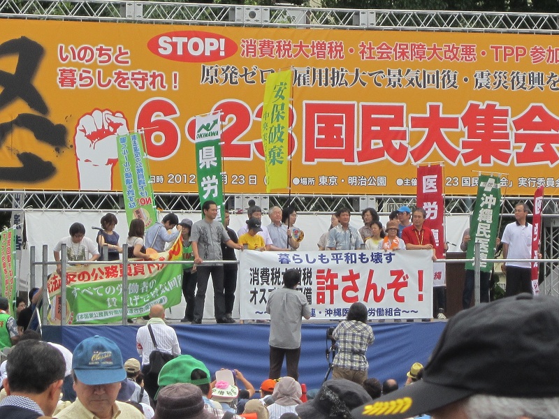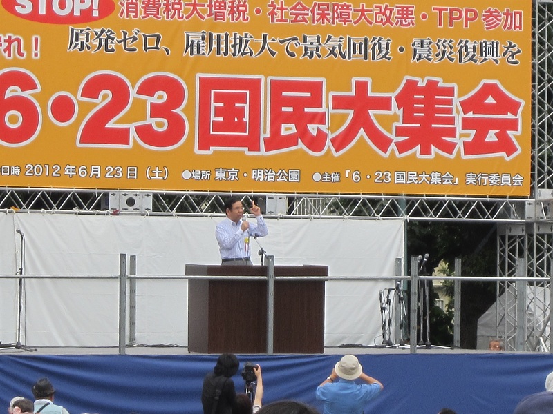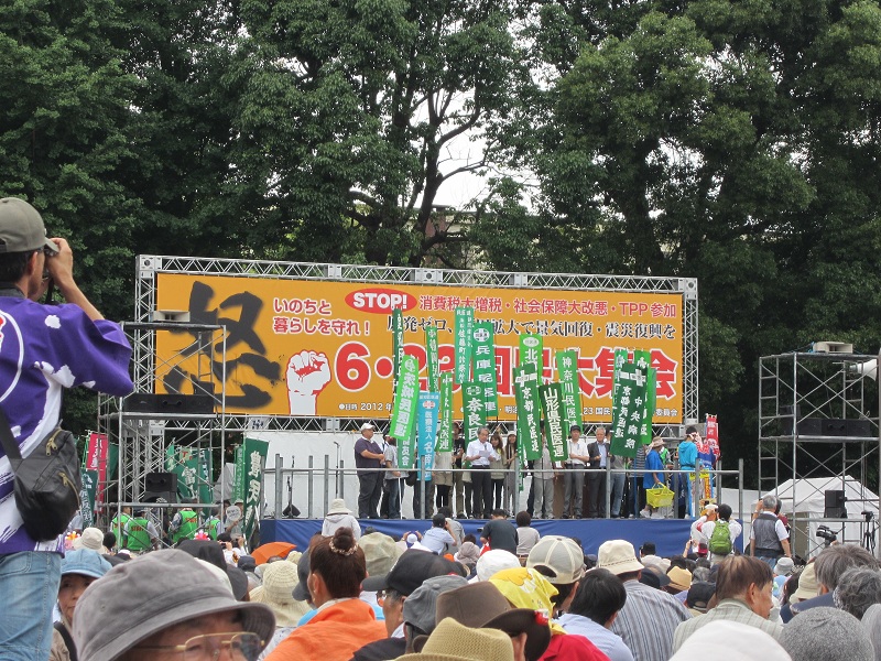 集会では、復旧・復興を願う被災地の人たちや、TPP参加反対を訴える農林水産業や医療関係者、仕事確保・雇用問題を訴えた青年たち、子育て新システムによる保育崩壊を心配する保育関係者、消費税増税されたら仕事を続けられないと訴える中小業者、オスプレイ配備反対・普天間基地無条件撤去を求める沖縄の人たちなど、さまざまな団体・個人が壇上に登り、民主党の公約違反への怒りと国民の生活・仕事破壊にきっぱりと反対していこうと口々に訴えました。