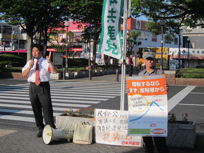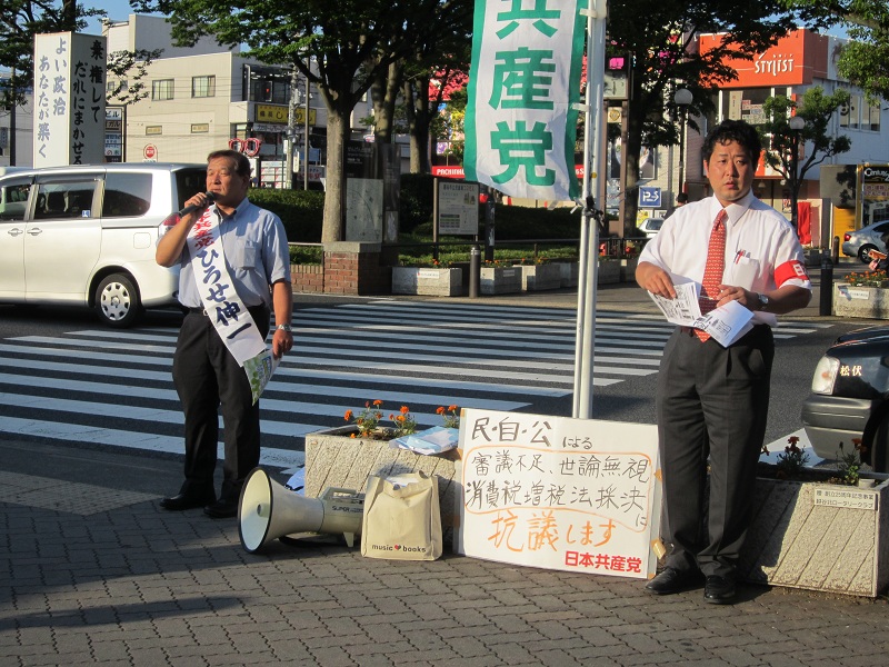 日本共産党は、本日午後の衆議院での、「税と社会保障の一体改革」にかかわる消費税大増税関連法案と社会保障切捨て関連法案の強行採決に反対し、全国各地で緊急の抗議宣伝行動に取り組みました。