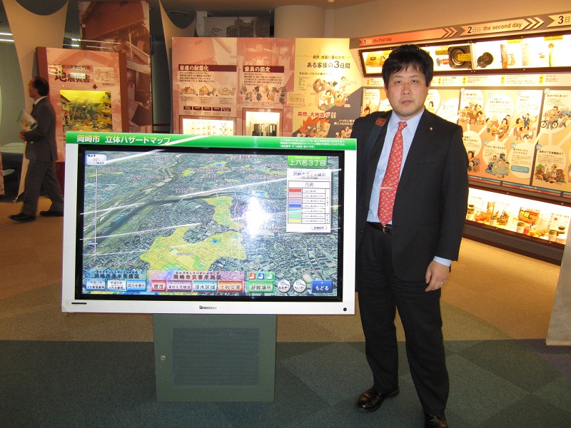 岡崎市役所は1階に防災展示コーナーがあり、その入り口に画面操作で様々な情報が表示される情報端末「立体ハザードマップ」があったので、その横で一枚。そもそも市全体としての防災意識の高さを感じました。