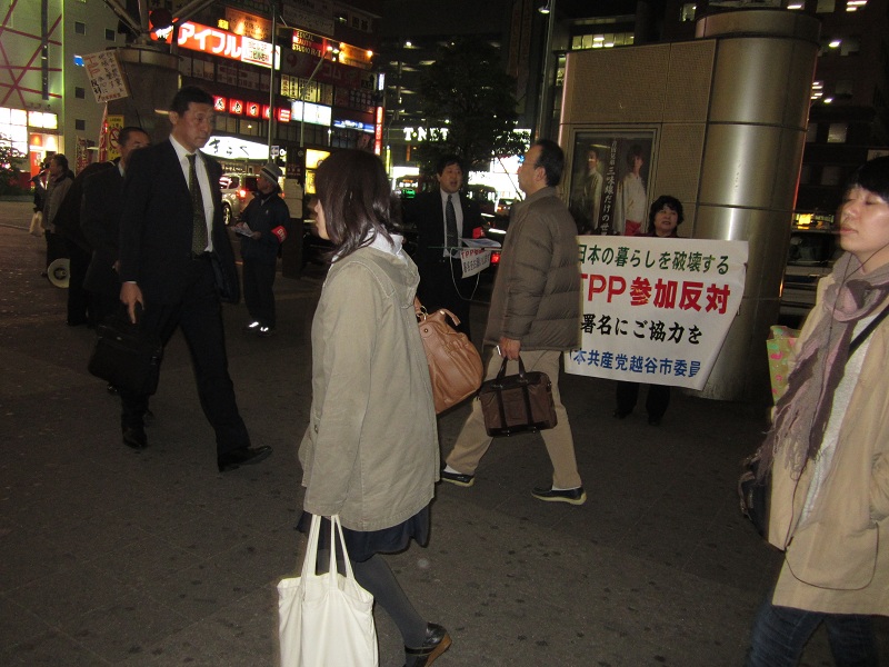 今日夕方は、南越谷駅で、このTPP交渉参加反対の宣伝行動を行いました。せめてもっと慎重な対応をするべきだとマイクで訴える中で、署名への協力もたくさんいただきました。