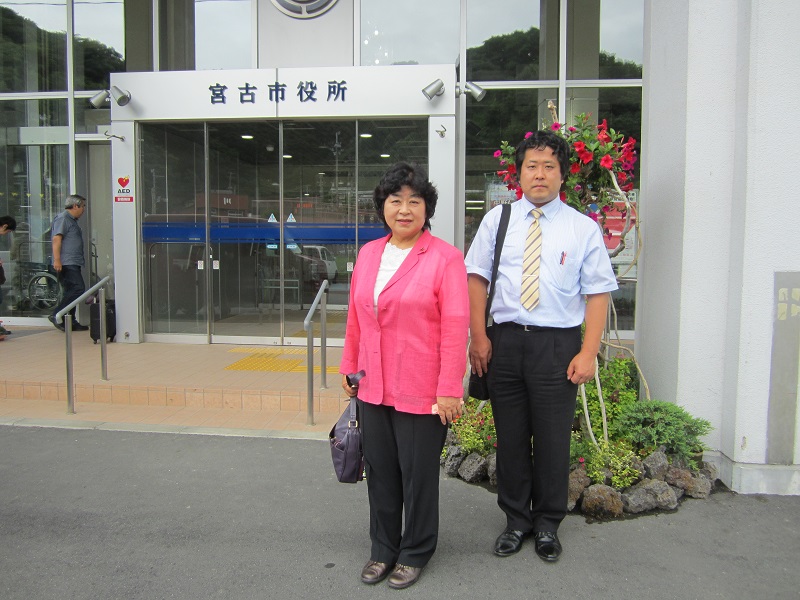 宮古市役所前で
