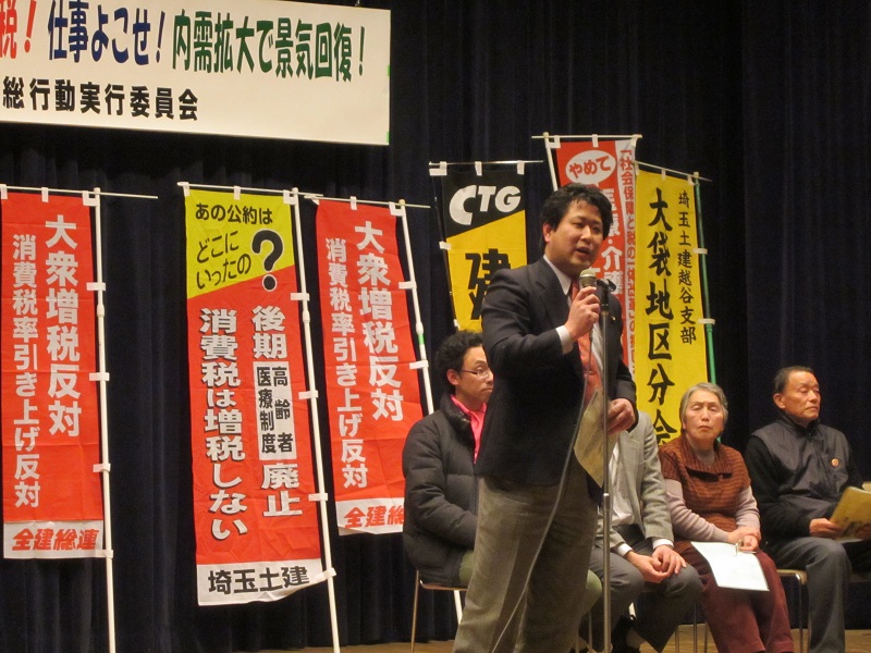 スローガンは「急げ復興!なくせ原発!許すな増税!仕事よこせ!内需拡大で景気回復!」とし、集会で消費税、社会保障、原発、TPPなど6つの課題について、各団体から取り組みの報告と決意表明を行いました。日本共産党は比例定数の削減について、「消費税増税という負担を押し付けながら、その前提として民意を削るもので許せない。無駄を削るというなら、まず政党助成金を削るべき。議席は国民の声を議会に届けるための大事な財産。比例定数削減にはきっぱり反対」と発言しました。