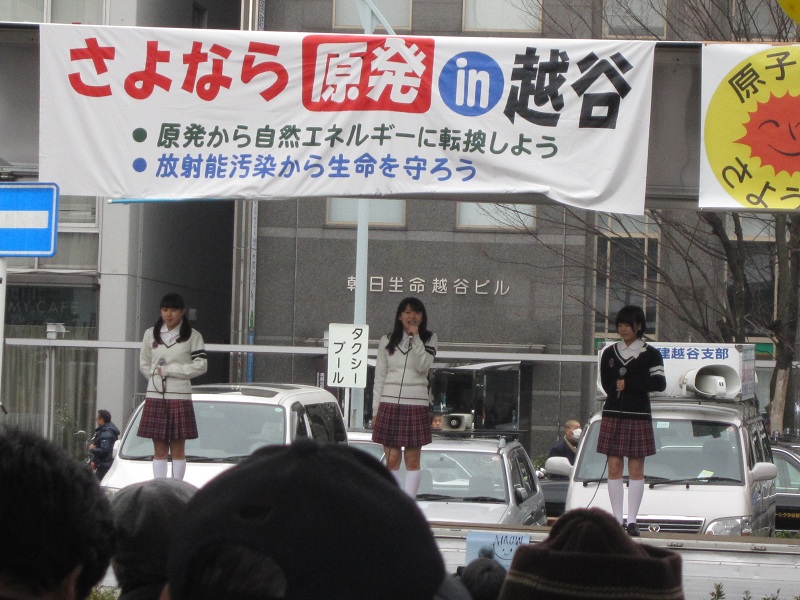 制服向上委員会が脱原発の歌を歌い、福島から避難してきている人や弁護団の人などがリレートークを行なって、通りがかりの人も足を止めて聞き入っていました。
