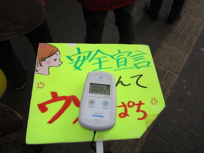 わたしも「安全宣言なんてウソっぱち」と書いたうちわを持って参加。ついでにその場の何ヶ所かで、放射線測定もおこなってきました。