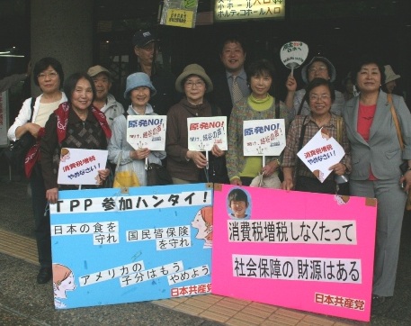 日本共産党金子議員団長が、スローガンや特別決議にも謳われている消費税増税反対や脱原発などを訴えるたびに、会場から拍手がわきあがっていました。