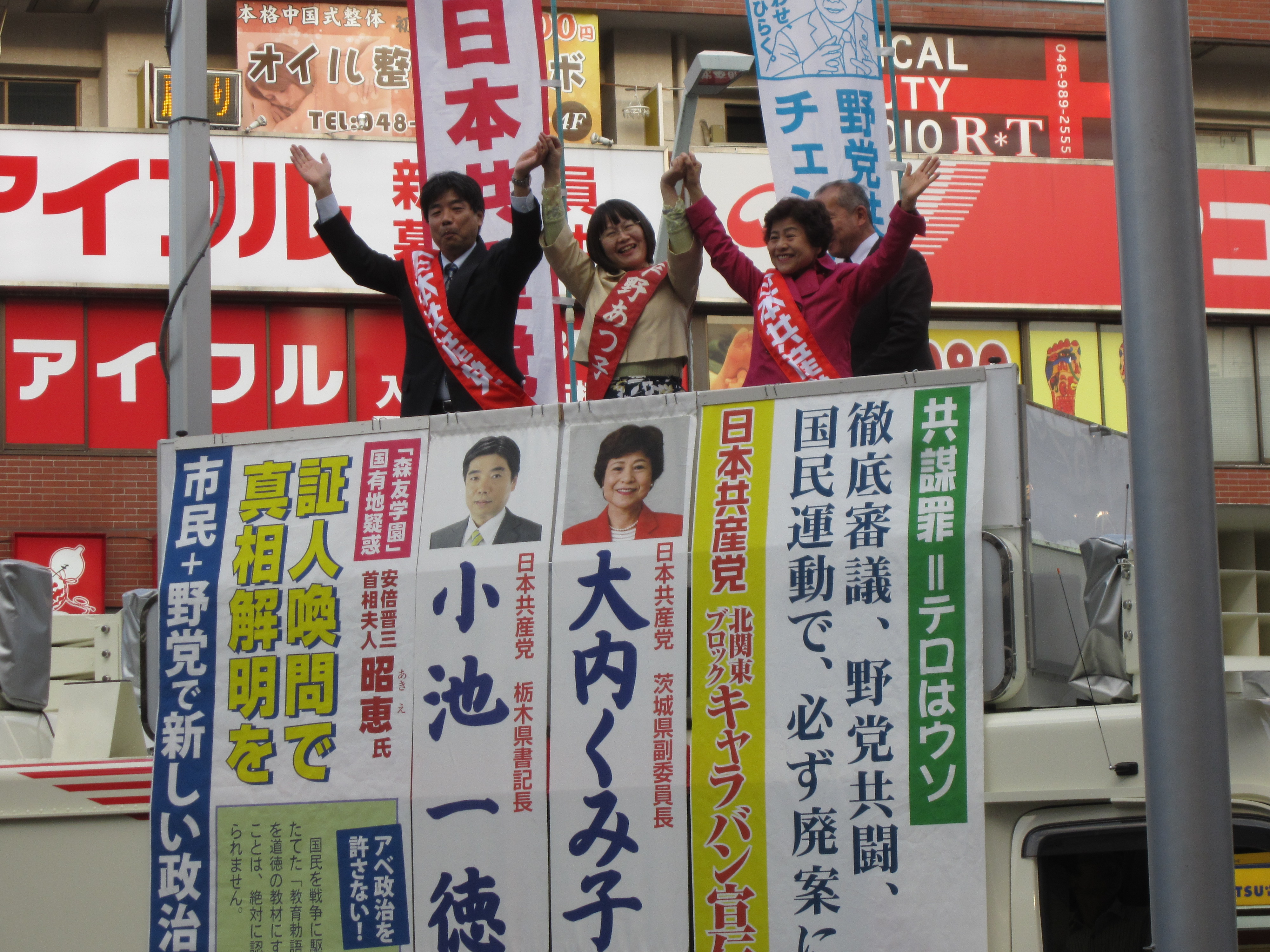 今日夕方、南越谷駅前で、来たるべき総選挙に向けた北関東比例ブロックのキャラバン宣伝がありました。