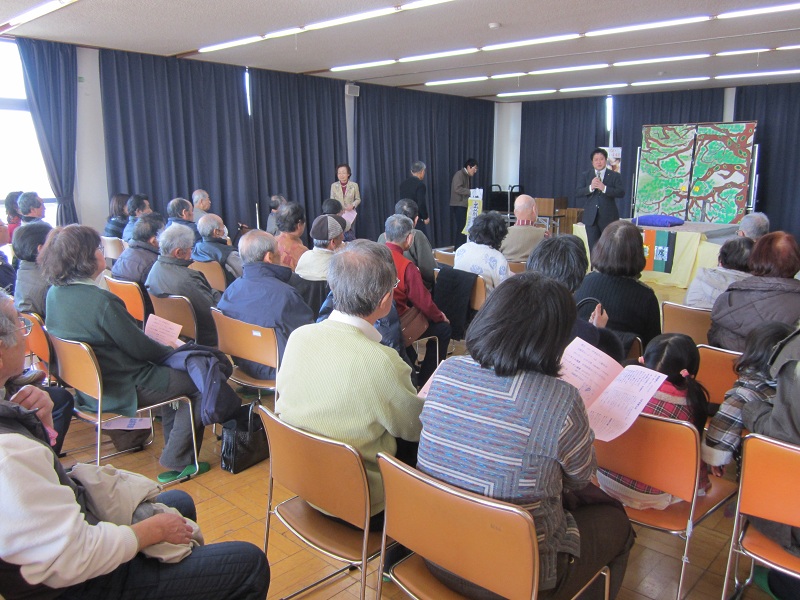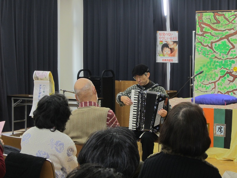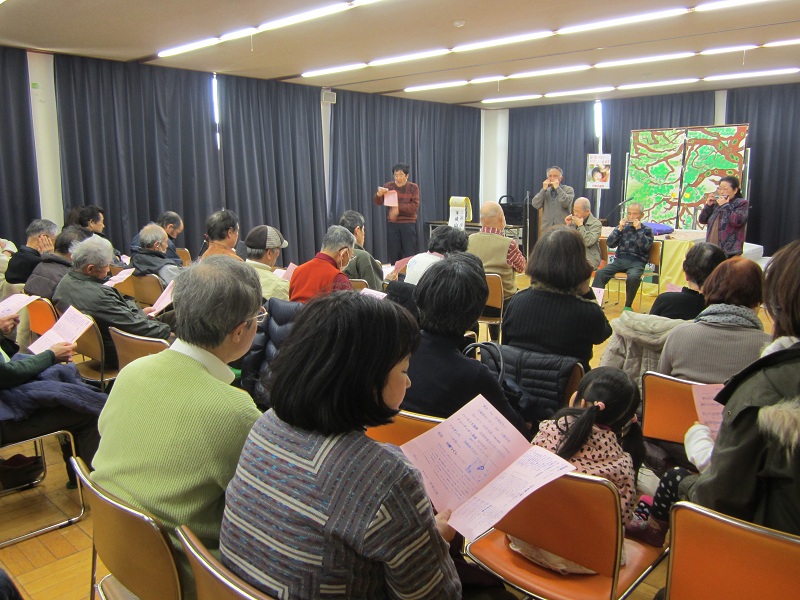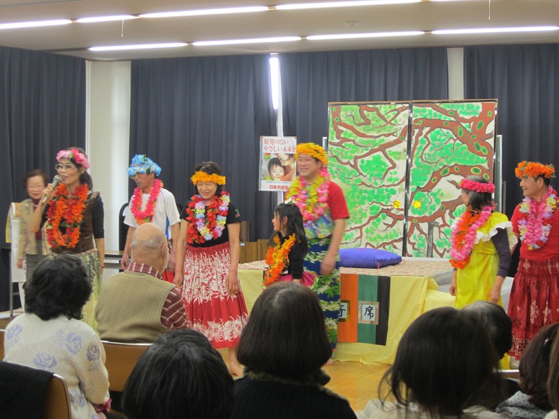 主催者あいさつや、わたしからの市政報告に続いて、第一部として、地域のみなさんのハモニカ演奏やアコーディオンに合わせて合唱、即席メンバーでのフラダンスが披露されました。